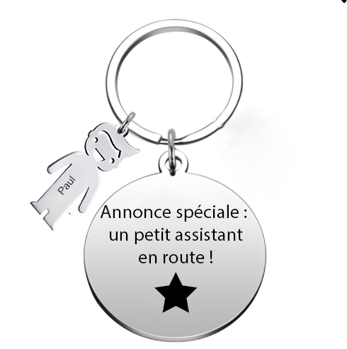 - Texte gravé au laser dans notre atelier parisien : "Annonce spéciale : un petit assistant en route !" et breloque personnalisée gravée avec le prénom du nouveau né